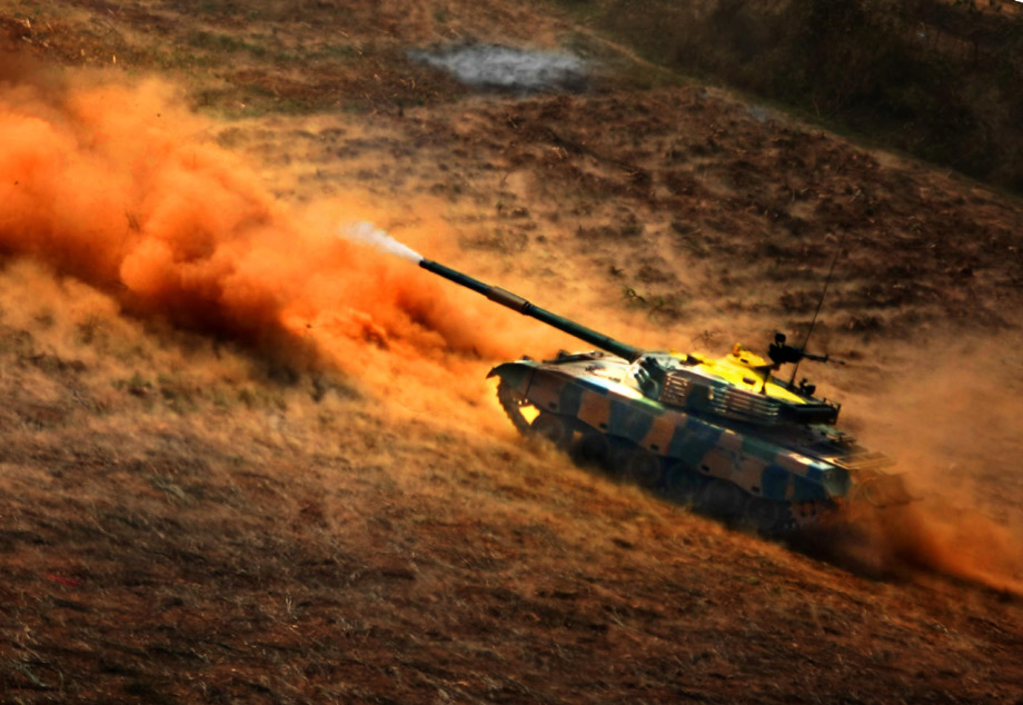 解放軍“前鋒-二00九A”演習(xí),二十二日在濟南軍區(qū)某合同戰(zhàn)術(shù)訓(xùn)練基地進行陸空聯(lián)合火力打擊實兵實彈演練。中新社發(fā) 宋吉河 攝