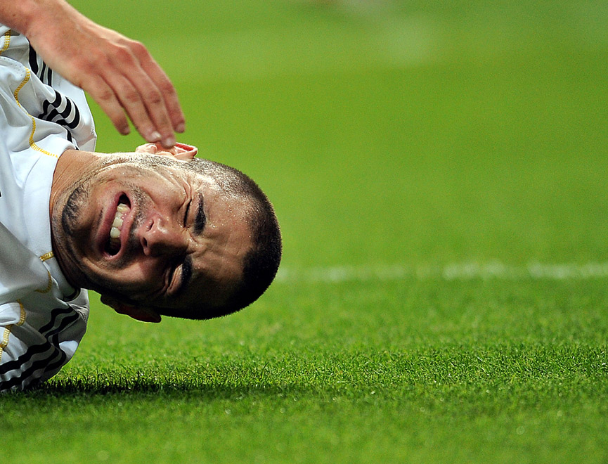周四(22日)伯納烏體育場(chǎng),皇馬前鋒本澤馬痛苦倒地。歐洲冠軍聯(lián)賽C組焦點(diǎn)戰(zhàn),皇馬在伯納烏球場(chǎng)迎戰(zhàn)AC米蘭隊(duì),皇馬以2比3告負(fù)。 來源:中國(guó)新聞網(wǎng)