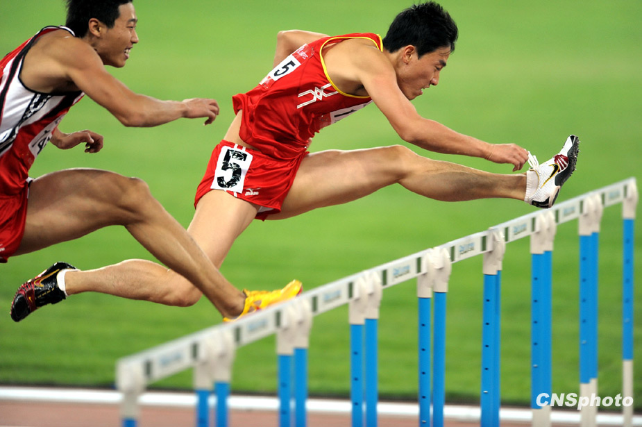 10月25日,在全運(yùn)會田徑男子110米欄決賽中,上海代表團(tuán)選手、“中國飛人”劉翔以13秒34的成績勇奪冠軍,同時也成就了其全運(yùn)會該項(xiàng)目三連冠的偉業(yè)。中新社發(fā) 陳文 攝