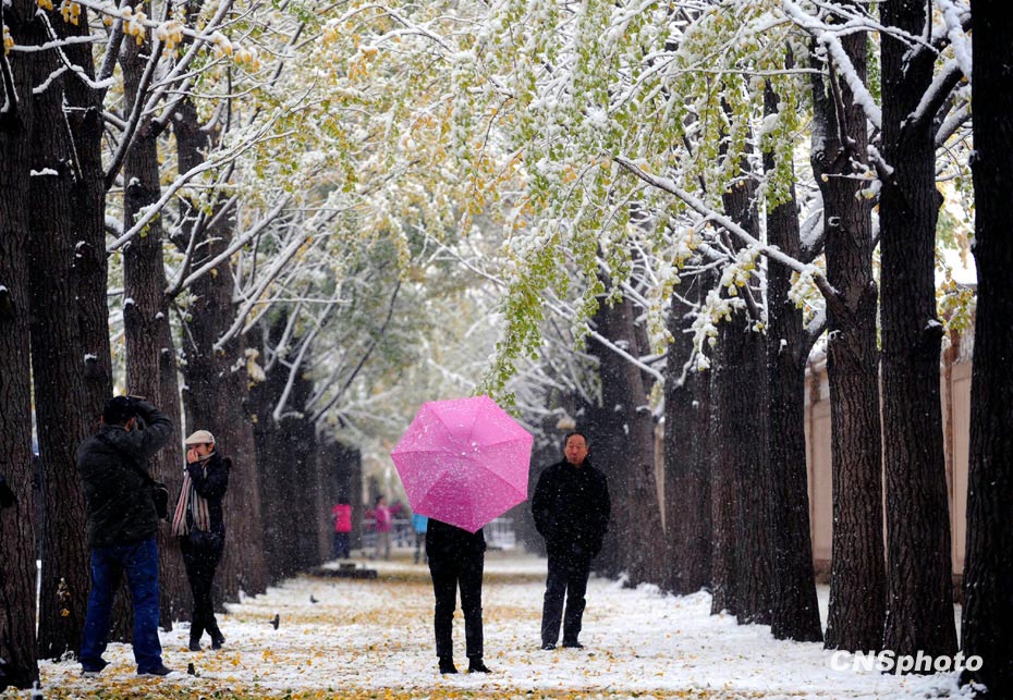 11月1日,深秋的北京大雪紛飛銀裝素裹,市民在銀杏樹林觀賞黃葉披上銀裝。北京今年的初雪時間提前了整整一個月。中新社發(fā) 廖攀 攝
