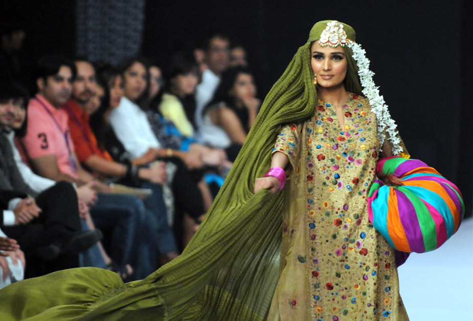 11月5日,巴基斯坦第一屆時(shí)裝周在卡拉奇拉開(kāi)帷幕。美女模特們身著裸露雙肩和肚臍的非伊斯蘭傳統(tǒng)服裝在T臺(tái)上走秀。