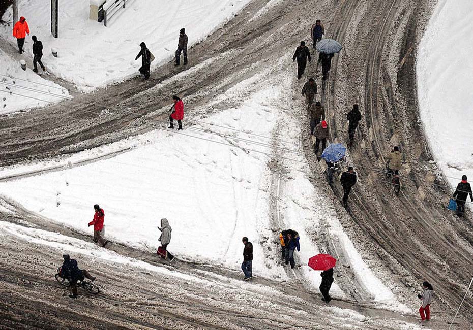 11月12日晨,鄭州市民在市區(qū)一個(gè)路口的機(jī)動(dòng)車(chē)道上匆匆行走。 連續(xù)的降雪使河南鄭州市區(qū)道路積雪較厚,許多地段還有折斷的樹(shù)木擋路,給市民出行帶來(lái)不便,很多人只得選擇步行或騎自行車(chē)上班。 新華社記者王頌攝 (來(lái)源:新華網(wǎng))