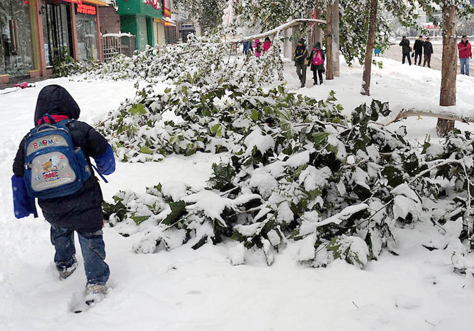 11月12日,一位上學(xué)的兒童從一棵被大雪壓倒的梧桐樹(shù)旁走過(guò)。 連日來(lái),暴雪不斷襲擊鄭州。大雪給鄭州的交通和群眾生活造成了嚴(yán)重影響。 王頌 攝 (來(lái)源:新華網(wǎng))