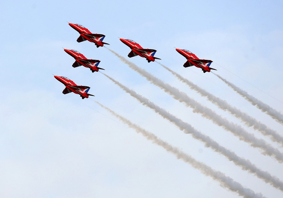 圖為紅箭飛行表演隊(duì)進(jìn)行表演。