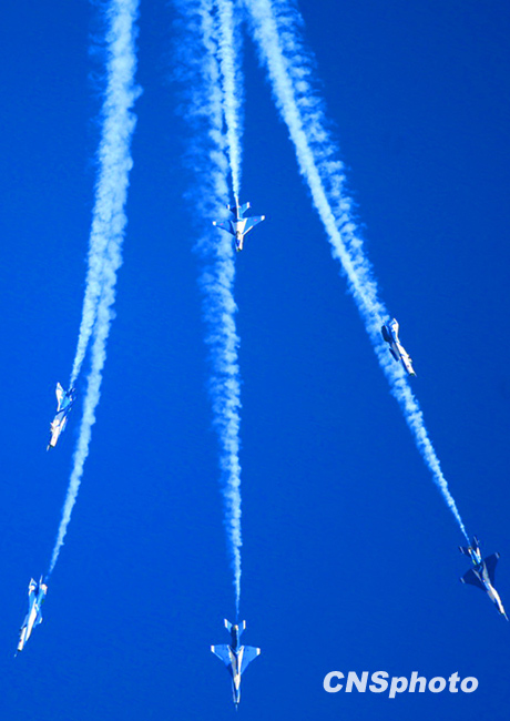 慶祝中國(guó)人民解放軍空軍成立60周年飛行表演,11月15日上午在北京沙河機(jī)場(chǎng)舉行。表演按八一飛行表演隊(duì)4架殲-10飛機(jī)表演12個(gè)動(dòng)作和6架殲-7GB飛機(jī)表演15個(gè)動(dòng)作,分四機(jī)對(duì)頭交叉、四機(jī)菱形隊(duì)大坡度盤旋、單機(jī)小速度平飛等27個(gè)動(dòng)作,其中四機(jī)對(duì)頭交叉動(dòng)作是這次表演中技術(shù)難度較大的動(dòng)作之一,這是國(guó)產(chǎn)三代飛機(jī)和國(guó)產(chǎn)二代飛機(jī)首次同場(chǎng)競(jìng)技表演。圖為殲-7GB表演六機(jī)向下開(kāi)花。中新社發(fā) 宋吉河 攝