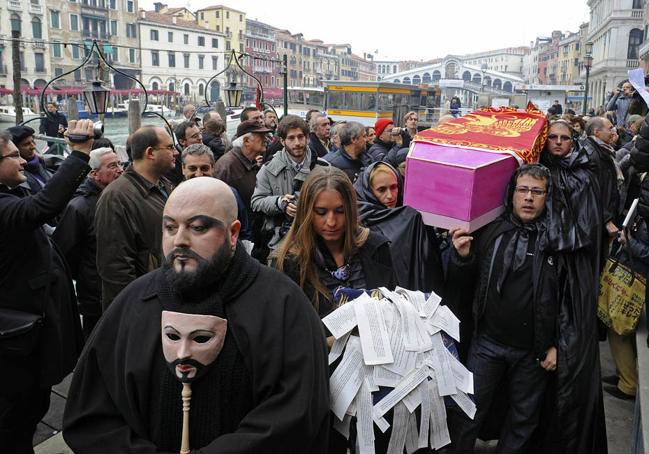 意大利北部歷史名城威尼斯人口跌至6萬以下,當?shù)厥S嗟木用?4日替自己的城市安排了一場“葬禮”,希望喚起世人對該市當前困境的重視。圖片來源:中國新聞網(wǎng)