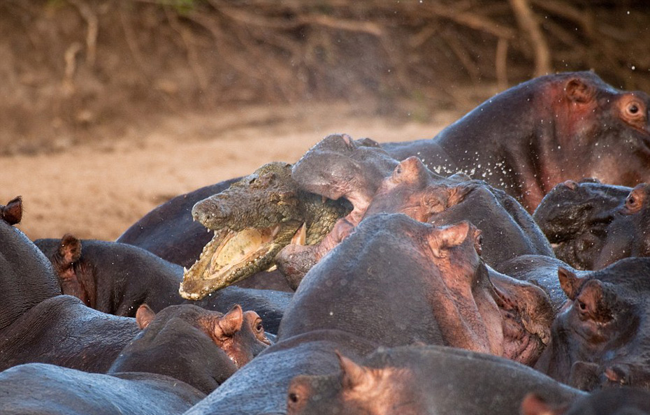 一條鱷魚悄悄混入了正在河里洗澡的河馬中,它很快就被敏感的母河馬發(fā)現(xiàn)。憤怒的河馬們立刻對(duì)它發(fā)起了猛烈地攻擊,這條冒失的鱷魚很快死于非命。