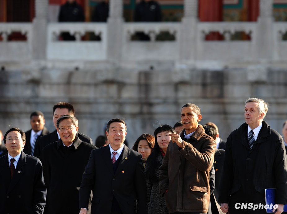 11月17日,正在中國進(jìn)行國事訪問的美國總統(tǒng)奧巴馬一行參觀北京故宮。圖片來源:中國新聞網(wǎng)