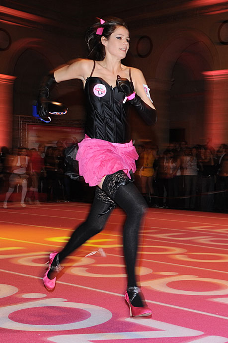 11月20日,法國(guó)巴黎舉行了有趣的室內(nèi)高跟鞋賽跑比賽,總共32支隊(duì)伍96人一爭(zhēng)高下。圖片來(lái)源:中國(guó)新聞網(wǎng)