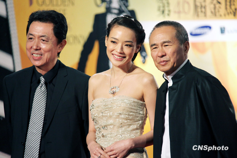 第46屆臺(tái)灣金馬獎(jiǎng)?lì)C獎(jiǎng)禮28日晚上在臺(tái)北盛大舉行。著名導(dǎo)演朱延平(左)、侯孝賢(右)和影星舒淇(中)聯(lián)袂出席。中新社發(fā) 黃少華 攝