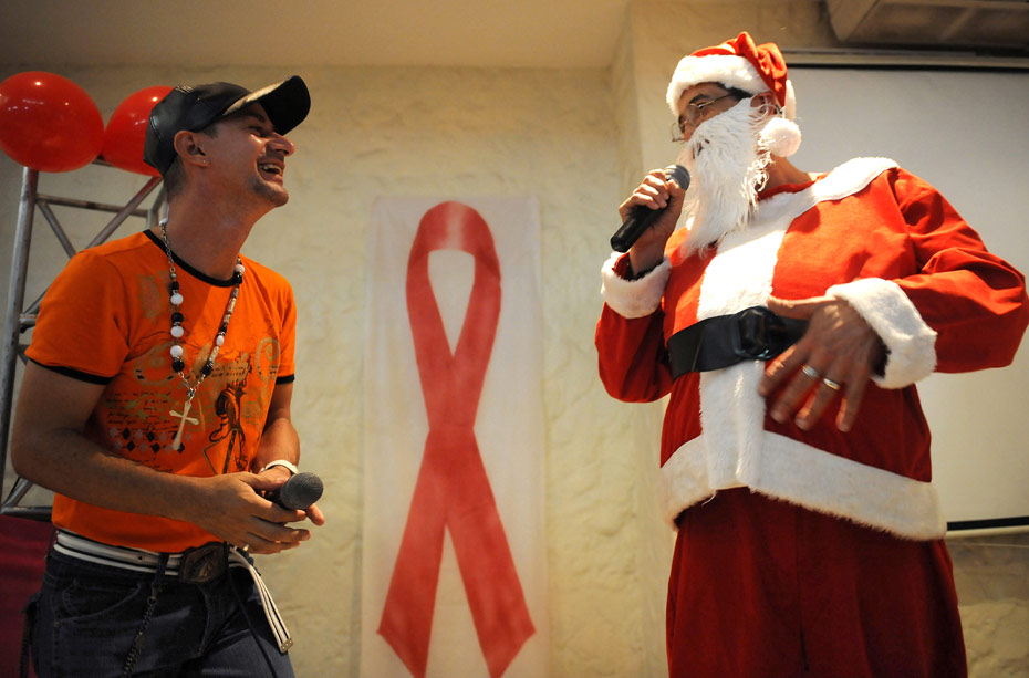 圖為哥倫比亞一位“圣誕老人”在為艾滋病日做宣傳。12月1日是世界艾滋病日,2009年世界艾滋病日的主題是“普遍可及和人權(quán)”。世界各地民眾組織各種活動(dòng)呼吁人們關(guān)注艾滋病。圖片來(lái)源:中國(guó)新聞網(wǎng)