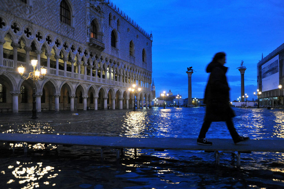 圖為行人走在在圣馬可廣場上臨時(shí)搭建的走道上。