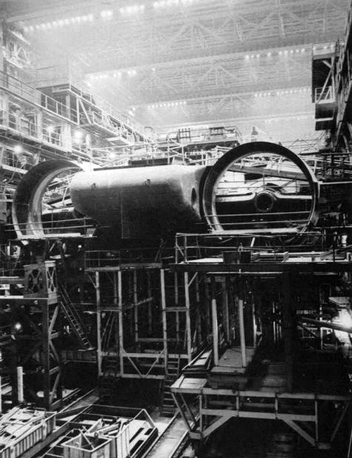 圖為建造中的“臺(tái)風(fēng)”級(jí)巨大的涵道式螺旋槳推進(jìn)器。圖片來源:人民網(wǎng)