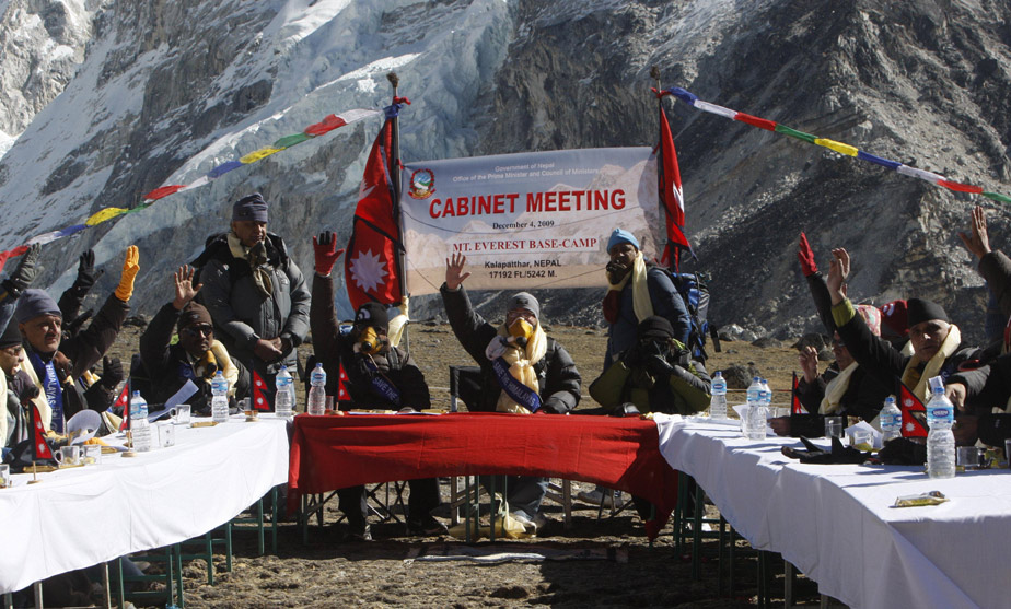12月4日,尼泊爾總理和22位部長在喜馬拉雅山海拔5262米的高度舉行內(nèi)閣會議,討論全球變暖對喜馬拉雅山的影響。呼吁人們切實采取行動,保護(hù)環(huán)境。