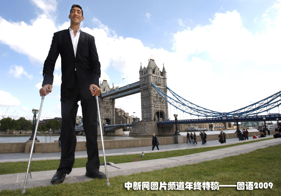 世界最高的人:9月16日,在英國倫敦泰晤士河傍的塔橋附近,身高2.46米的土耳其農(nóng)民蘇丹·古錢加冕吉尼斯世界紀錄“世界最高人”桂冠。圖片來源:中國新聞網(wǎng)