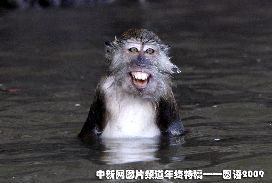 馬來西亞的一個(gè)地質(zhì)公園內(nèi),一只長(zhǎng)尾獼猴在水中“大笑”。