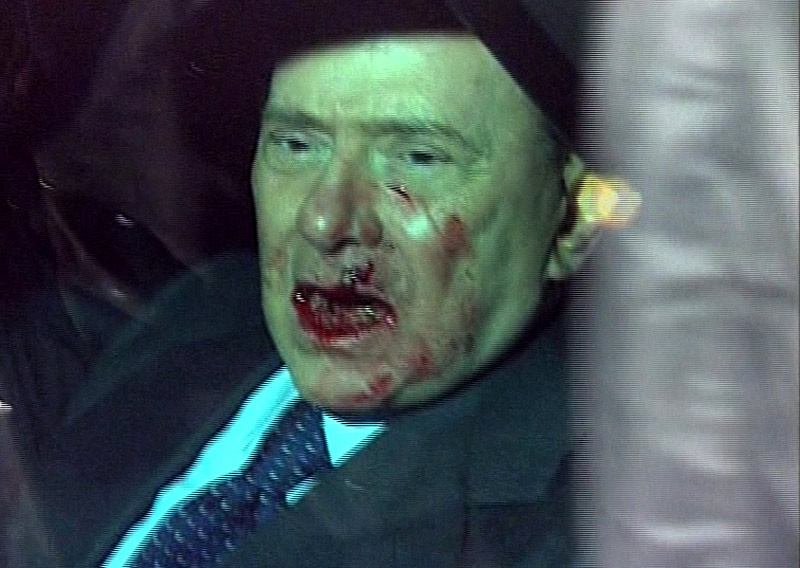 意大利總理貝盧斯科尼13日晚間受邀在米蘭參加一個(gè)集會(huì)時(shí)遭到襲擊,面部受傷流血,隨后被緊急送醫(yī)治療。圖片來(lái)源:中國(guó)新聞網(wǎng)