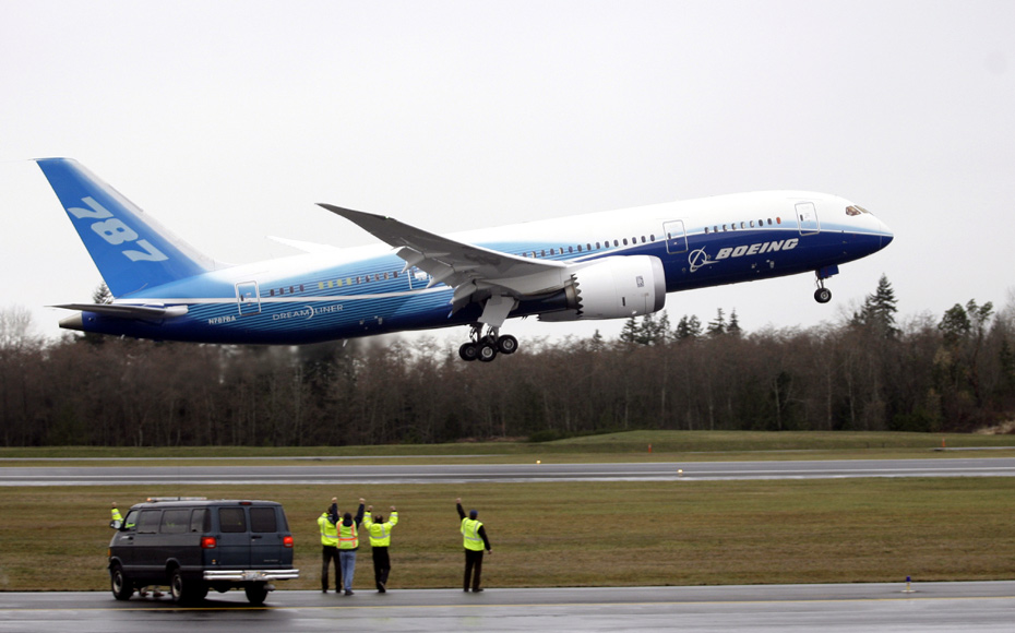 當(dāng)?shù)貢r(shí)間15日上午10時(shí),華盛頓州埃佛瑞特潘恩機(jī)場(chǎng),兩名飛行員邁克爾•卡瑞克爾和蘭多爾•內(nèi)維勒駕駛的波音787飛機(jī)順利升空,在飛行了大約四個(gè)多小時(shí)后返回地面。
