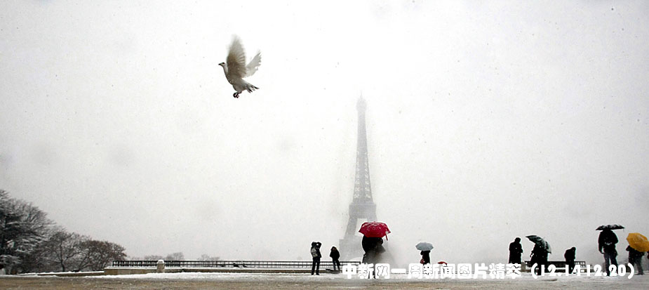 17日(周四),巴黎降下大雪,一只白鴿冒雪飛起,不遠(yuǎn)處的埃菲爾鐵塔在雪中若隱若現(xiàn)。圖片來源:中國新聞網(wǎng)