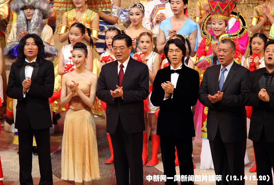 19日(周六)晚間,澳門特區(qū)舉行盛大文藝晚會(huì),慶祝澳門回歸祖國十周年。國家主席胡錦濤與演員一起唱響《歌唱祖國》。圖片來源:中國新聞網(wǎng)