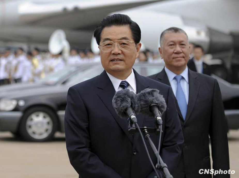 12月19日中午,中共中央總書記、國家主席、中央軍委主席胡錦濤乘專機(jī)抵達(dá)澳門并在機(jī)場發(fā)表講話。中新社發(fā) 廖攀 攝