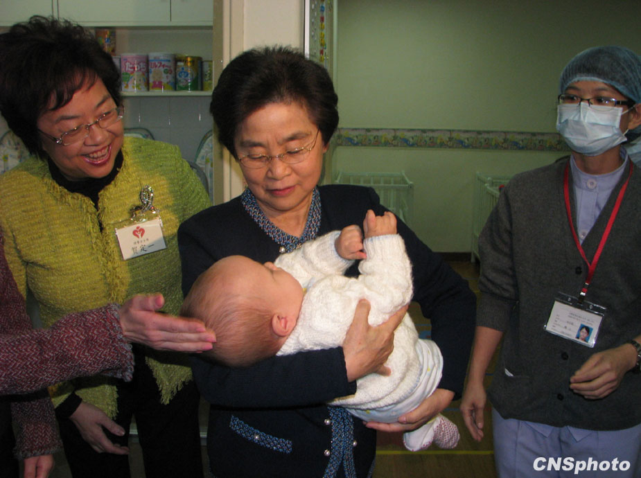 12月19日下午,國(guó)家主席胡錦濤的夫人劉永清參觀澳門母親會(huì)托兒所時(shí),抱起一名不足一歲的嬰兒。中新社發(fā) 于晶波 攝