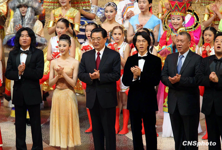 十二月十九日晚,澳門特區(qū)舉行盛大文藝晚會(huì),慶祝澳門回歸祖國(guó)十周年。國(guó)家主席胡錦濤與演員一起唱響《歌唱祖國(guó)》。中新社發(fā) 洪少葵 攝