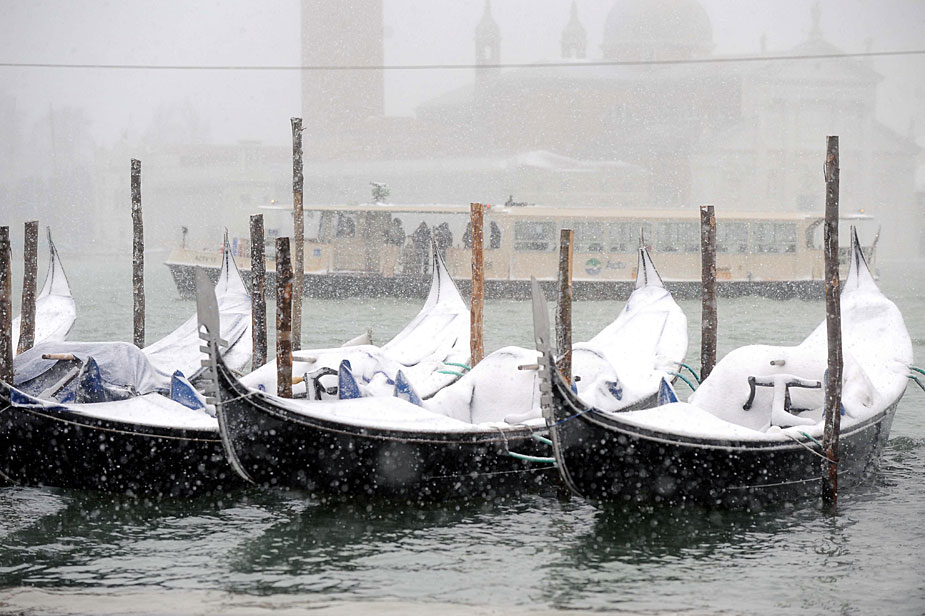 圖為12月19日,意大利威尼斯大雪飄降在冰冷的水面上。