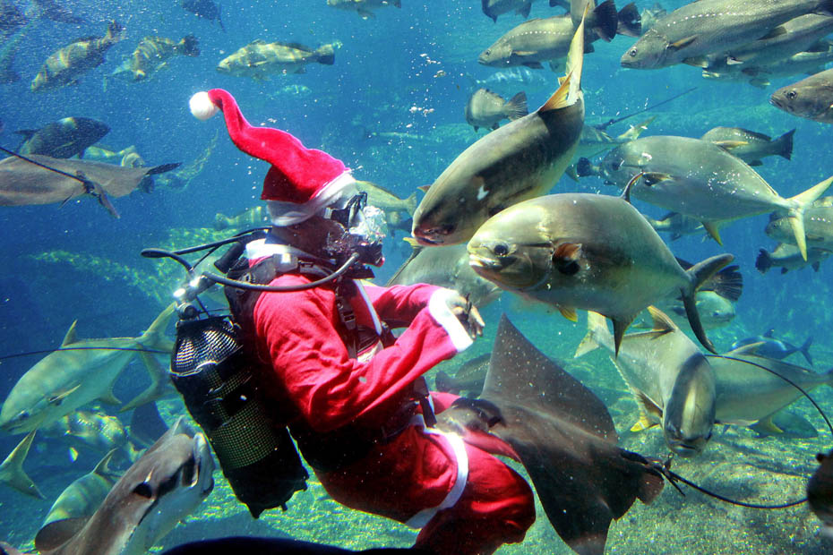 圖為迪拜海底世界主題公園內一個身著圣誕老人服裝的飼養(yǎng)員在水中喂食。