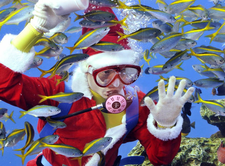 圖為東京橫濱八景島海洋樂園的潛水員著圣誕服飾潛入水中。