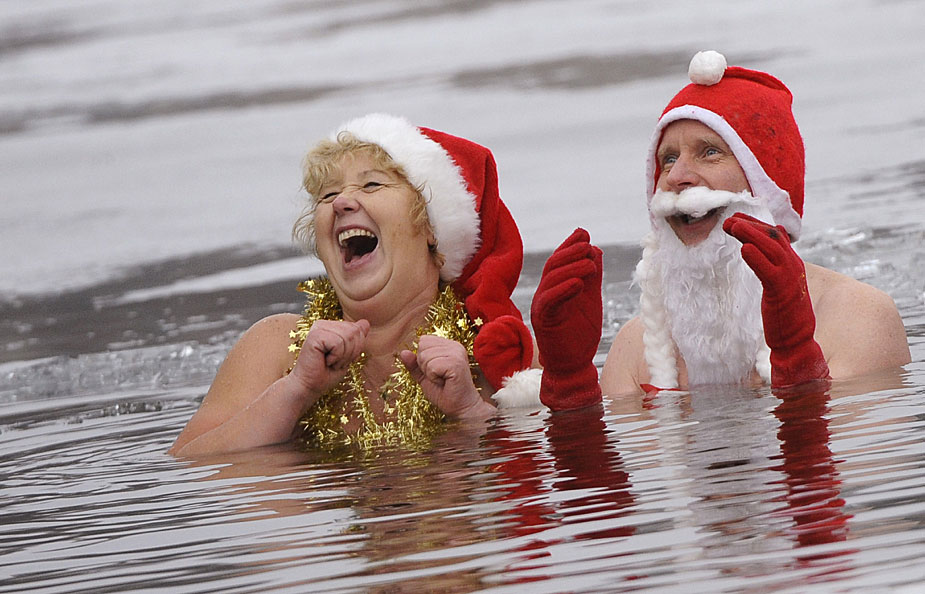 12月25日,德國柏林的冬泳俱樂部“柏林海豹”(Berliner Seehunde)的成員不畏寒冬,光著身子在已經(jīng)結(jié)冰的Oranke湖中暢游一番。圖片來源:中國新聞網(wǎng)