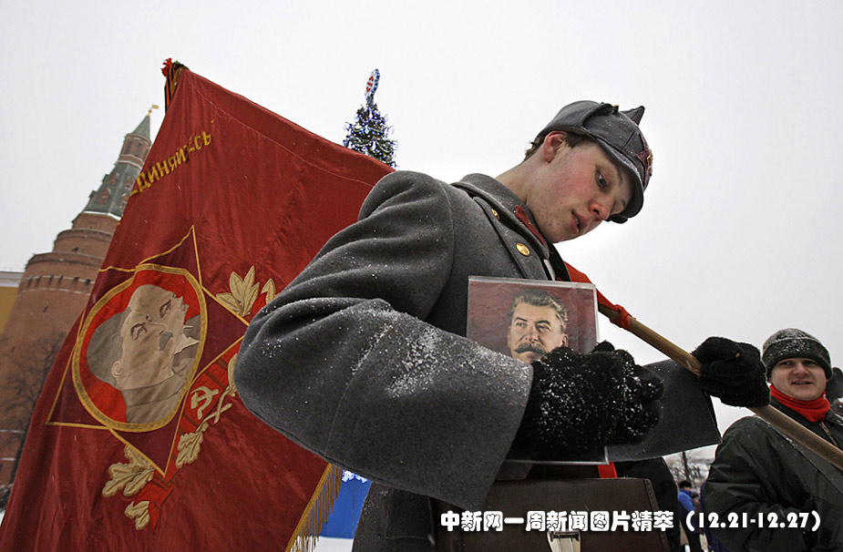 21日(周一),一名俄羅斯士兵手持斯大林肖像,等著向莫斯科紅場(chǎng)上的斯大林墓敬獻(xiàn)鮮花,以紀(jì)念這位前蘇聯(lián)領(lǐng)導(dǎo)人130周年誕辰。