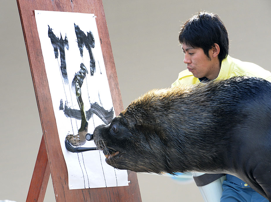 12月30日,日本神奈川八景島海洋樂園水族館內(nèi),海獅表演了用毛筆在紙上“寫”漢字的節(jié)目。圖片來(lái)源:中國(guó)新聞網(wǎng)