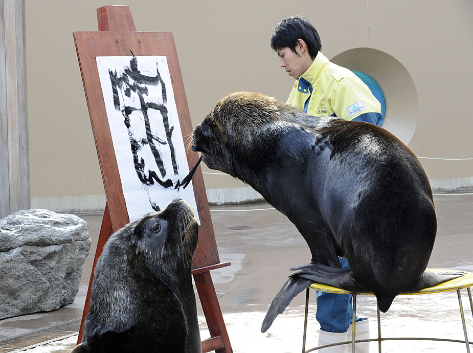 12月30日,日本神奈川八景島海洋樂(lè)園水族館內(nèi),海獅表演了用毛筆在紙上“寫(xiě)”漢字的節(jié)目。圖片來(lái)源:中國(guó)新聞網(wǎng)
