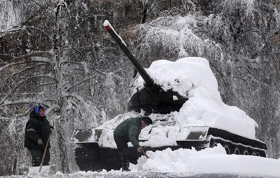 圖為12月29日,烏克蘭首都基輔的二戰(zhàn)紀(jì)念碑前,工作人員正在除雪。