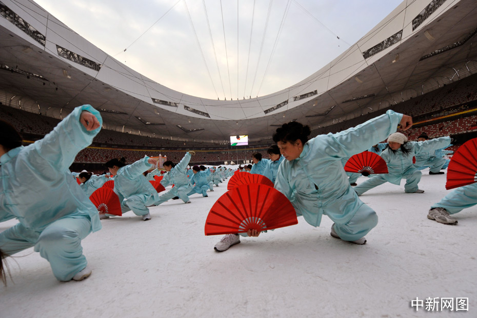 2010年1月1日上午,2010人在被冰雪覆蓋的鳥巢內表演了太極拳、武功扇等民族傳統健身項目。中新網記者 金碩 攝