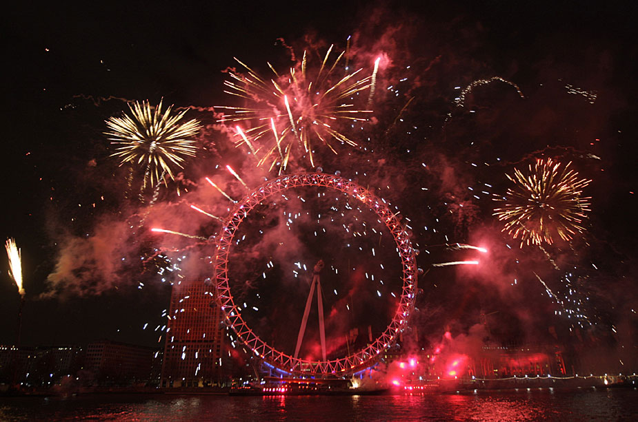 圖為2010年1月1日,位于英國倫敦的“倫敦眼”周邊燃放起了美麗的煙花。