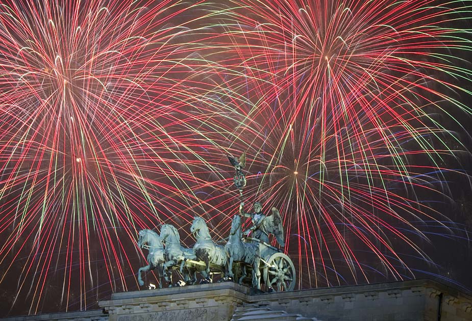 圖為2010年1月1日,焰火在德國柏林勃蘭登堡門上空綻放,慶祝新年的到來。