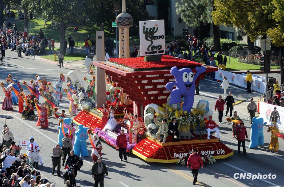 美國當(dāng)?shù)貢r(shí)間1月1日,第121屆美國玫瑰花車大游行在加州帕薩迪納市隆重舉行。著名影星成龍助陣中國上海世博花車。圖片來源:中國新聞網(wǎng)
