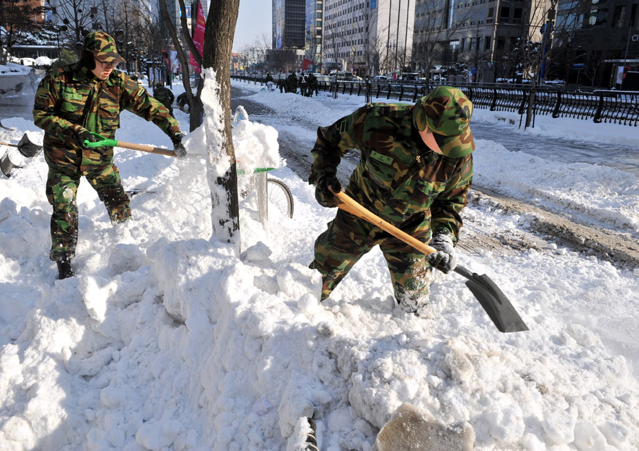 四日,韓國大部分地區(qū)遭遇大雪。至下午二時左右,首爾地區(qū)積雪厚度超過二十八厘米,這是韓國自一九三七年開始進行積雪量觀測以來的最新紀錄。圖為1月5日,韓國士兵在街頭除雪。