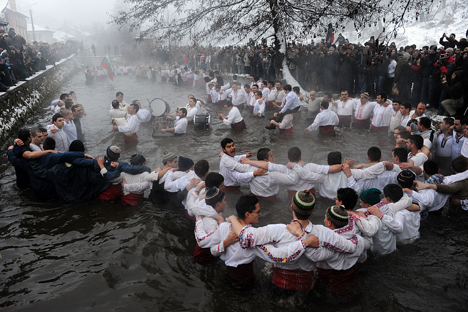 1月6日,在保加利亞卡洛菲爾市,人們在冰冷的河水中跳起保加利亞民間舞蹈霍洛舞,相互祝福在新的一年里身體健康,事事順?biāo)臁D片來源:中國新聞網(wǎng)