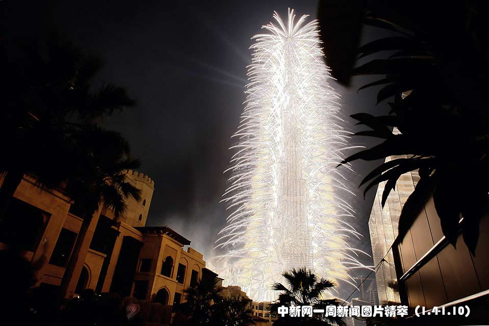 1月4日(周一),世界第一高塔“哈利法塔”(Burj Khalifa)在迪拜揭幕,揭幕典禮上煙花綻放。這座塔高2,717英尺(約合828米),造價為15億美元。圖片來源:中國新聞網(wǎng)