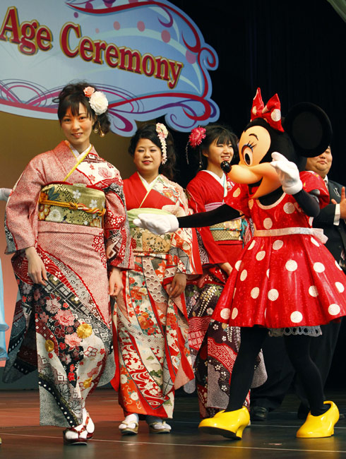 1月11日,日本迎來2010年的成人節(jié)日,所有年滿20歲的年輕人都將在這一天宣告自己邁進了成人行列。眾多年輕的日本女孩身穿和服在東京迪斯尼樂園里快樂游玩,迎接自己的節(jié)日。