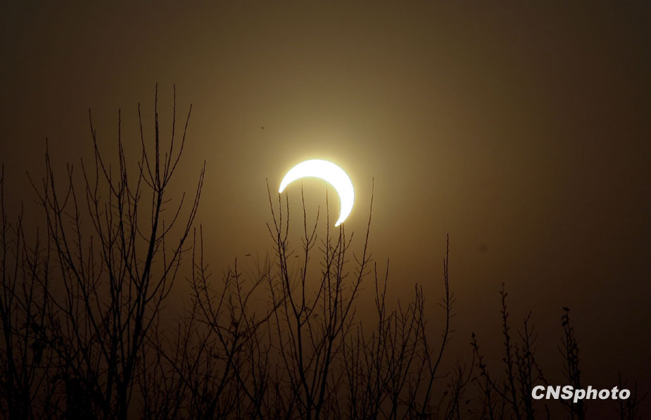 1月15日,“千年一遇”的日環(huán)食在北京呈現(xiàn)日偏食景觀(guān)。北京黃昏落日如“彎月”。中新社發(fā) 盛佳鵬 攝