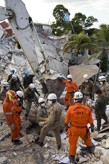 1月16日,海地首都太子港,中國國際救援隊在聯(lián)海團(tuán)總部對遇難者進(jìn)行搜尋工作。此前八名中方失蹤人員的遺體已全被找到。圖片來源:中國新聞網(wǎng)