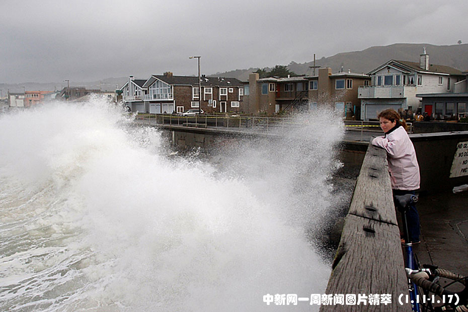 1月13日(周三),在加利福尼亞州帕西非卡,舒爾茨(Kim Schulz)看著巨浪拍打海堤。在加州北部和中部的一些地區(qū),浪高超過20英尺。圖片來源:中國新聞網(wǎng)