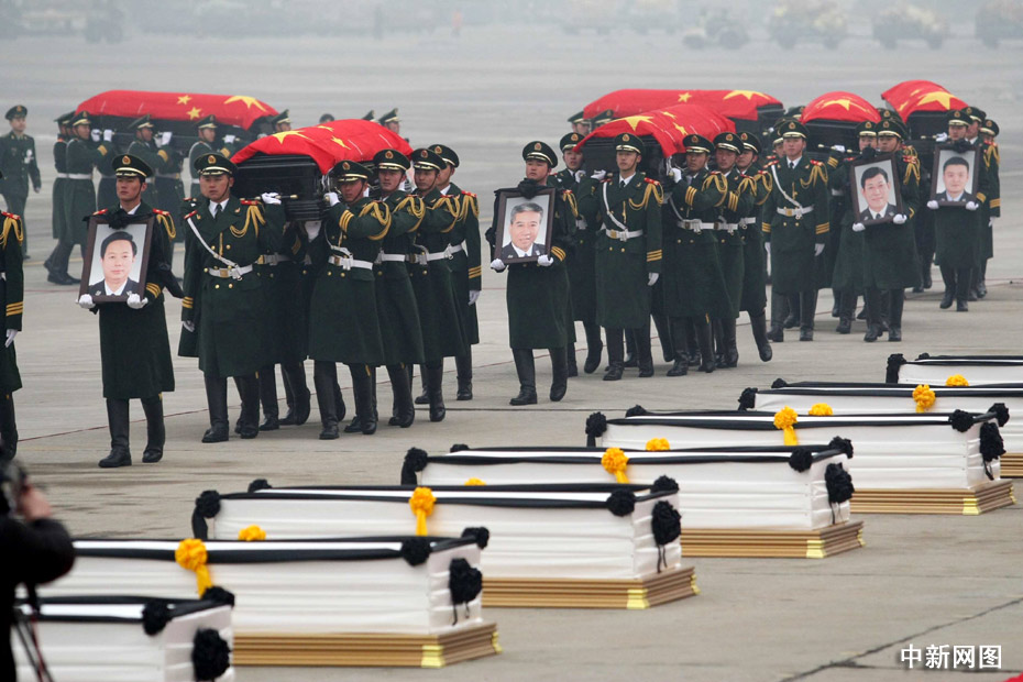 1月19日上午,在海地地震中犧牲的八位中國維和警察遺體回國接機(jī)儀式在北京首都機(jī)場舉行。中新社記者 富田 攝