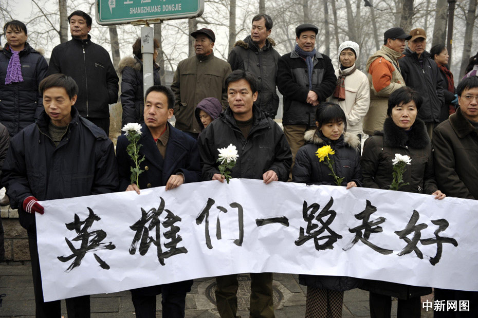1月19日,北京民眾自發(fā)守候在通往北京八寶山殯儀館的路口迎接英烈的靈柩。當(dāng)日,八位海地地震遇難中國維和警察的靈柩搭乘專機(jī)將抵達(dá)北京。中新網(wǎng)記者 金碩 攝