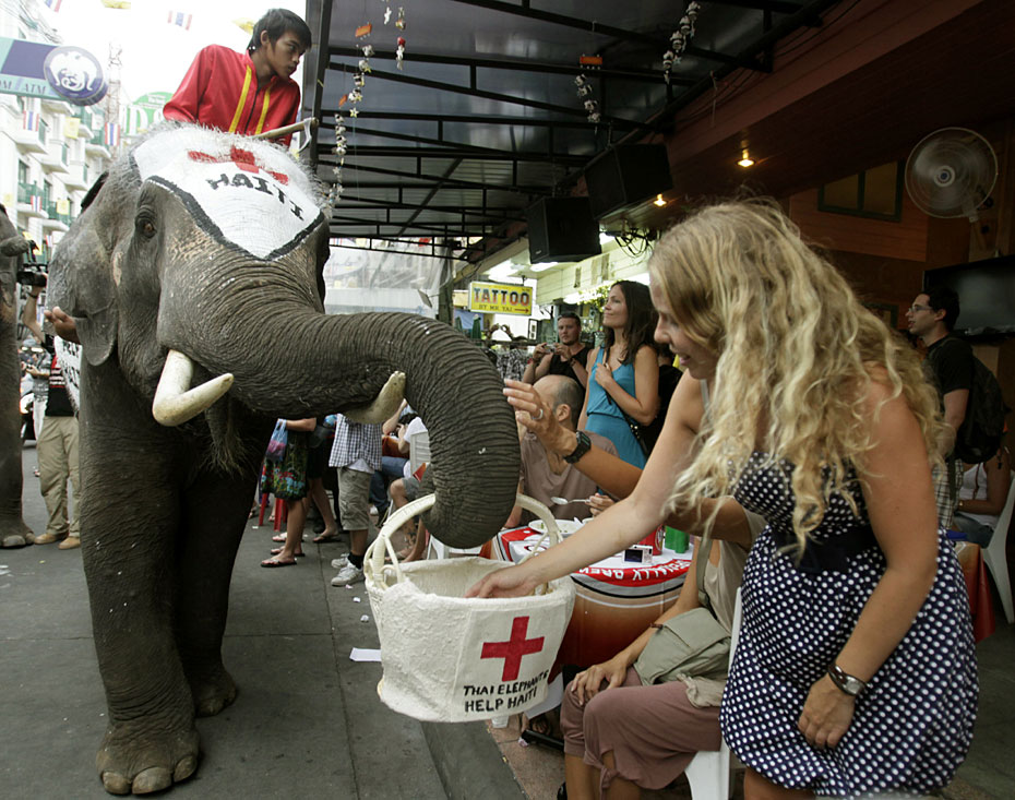 1月21日,在泰國首都曼谷舉辦了一場大象為海地災區(qū)募捐活動。人們紛紛向大象攜帶的籃子內(nèi)放入善款,向海地地震幸存者獻上一份愛心。圖片來源:中國新聞網(wǎng)
