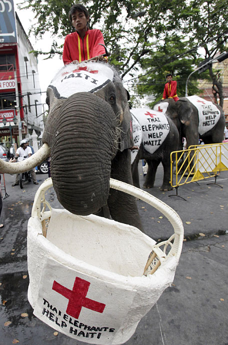 1月21日,在泰國首都曼谷舉辦了一場大象為海地災(zāi)區(qū)募捐活動。人們紛紛向大象攜帶的籃子內(nèi)放入善款,向海地地震幸存者獻(xiàn)上一份愛心。圖片來源:中國新聞網(wǎng)